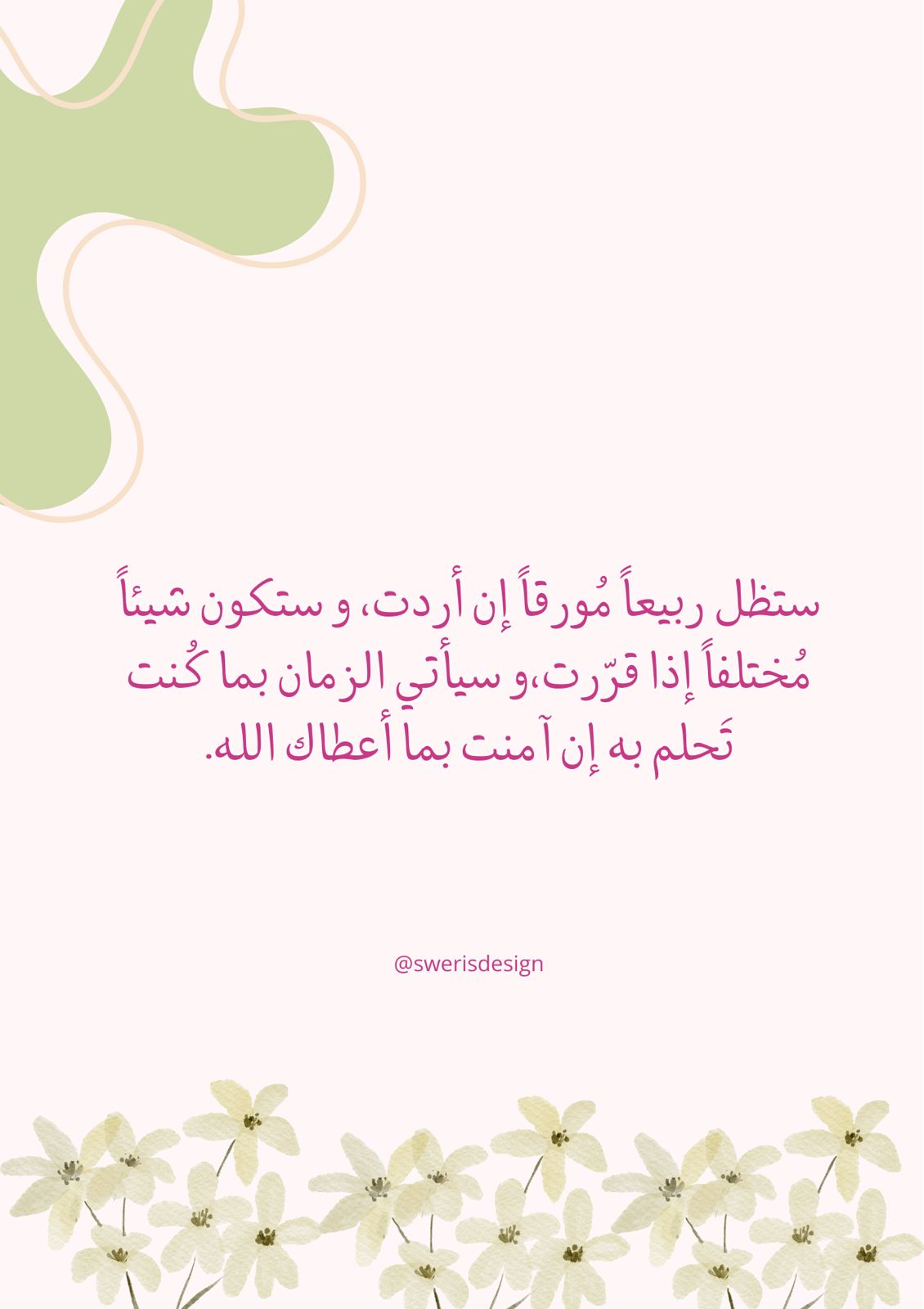 ستظل ربيعاً مُورقاً إن أردت، و ستكون شيئاً مُختلفاً إذا قرّرت، و سيأتي الزمان بما كُنت تَحلم به إن آمنت بما أعطاك الله